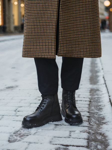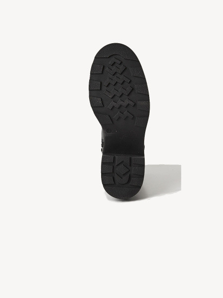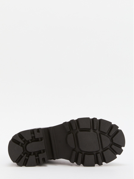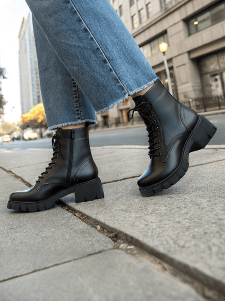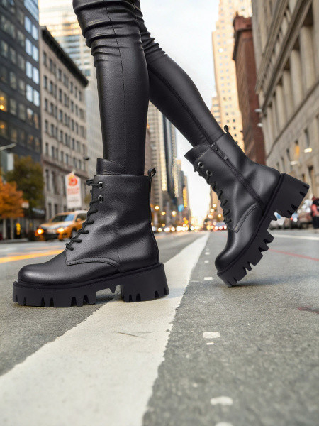 - ботинки в армейском стиле со шнуровкой, металлическими скобами, карманами на голенище и рельефной подошвой с каблуком разной высоты;