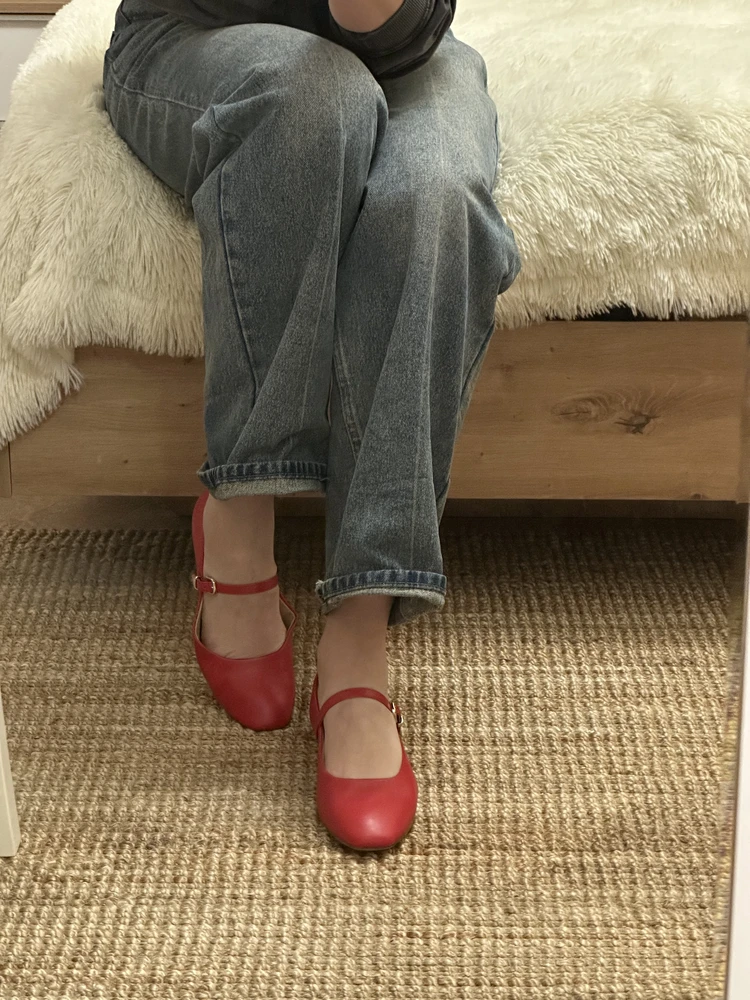 Аккуратные красные туфельки, на ножке смотрятся красиво.