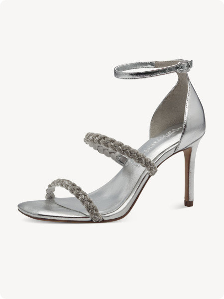 - Два узких ремешка босоножек, сделанных в виде переплетенной косички, украшенной кристаллами в тон и поддерживающих пальчики и подъем стопы, сразу привлекают к себе внимание. Тонкий ремешок вокруг щиколотки надежно удерживает пару на ноге и при ходьбе не сковывает положение стопы. Металлизированный или черный матовый цвет верха продолжается и на высокой устойчивой шпильке, привлекая внимание к общему образу. Пара застегивается миниатюрной боковой пряжкой. Мягкая основная стелька Touch it адаптируется под индивидуальные особенности стопы и обеспечивает постоянные комфортные ощущения при носке.