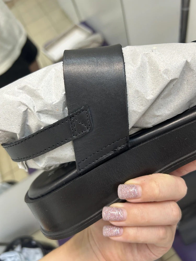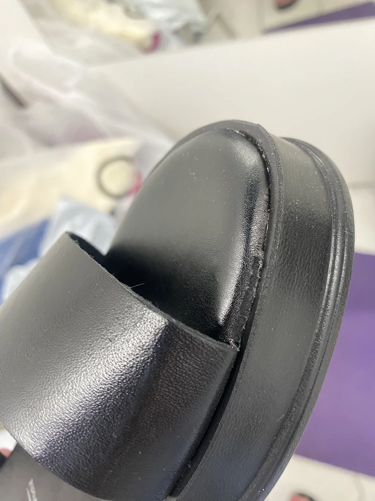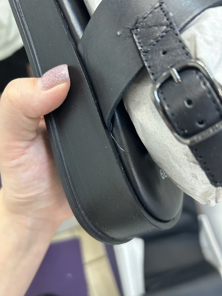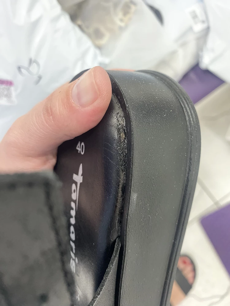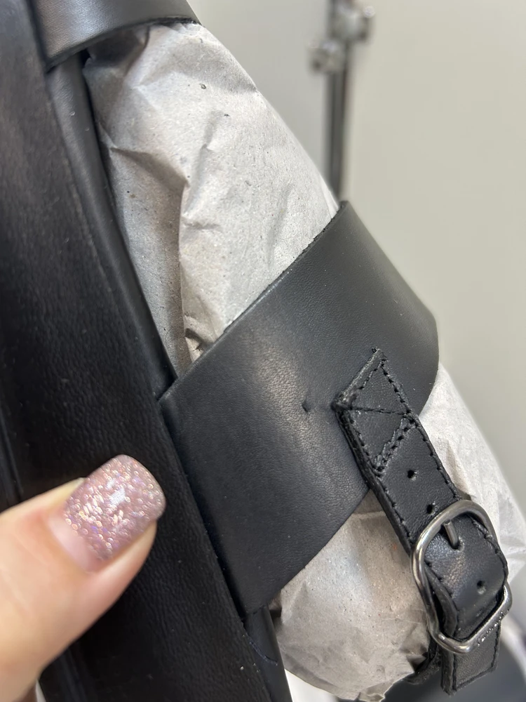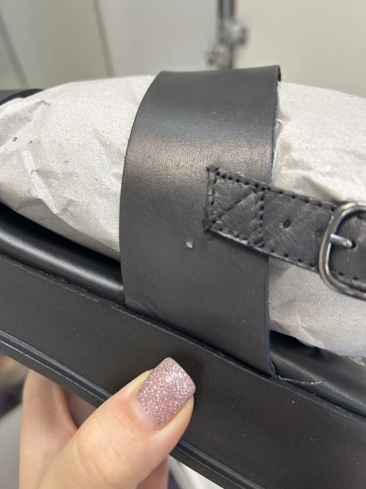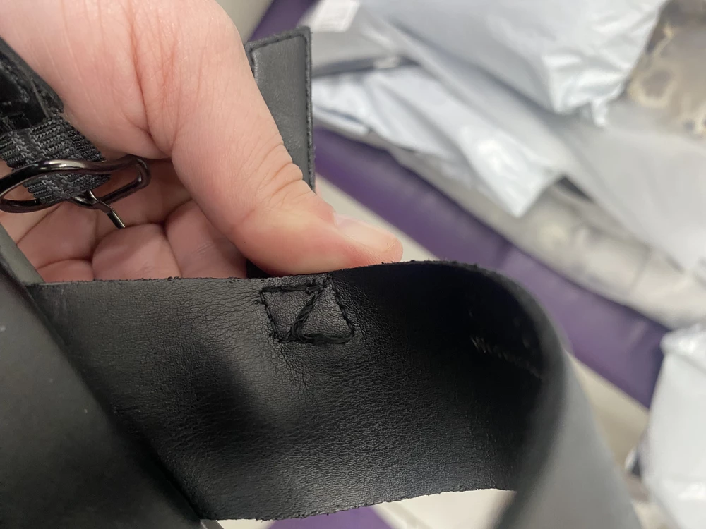 Недостатки: следы клея, непрошитые детали, торчащие нитки, шкорябка на коже