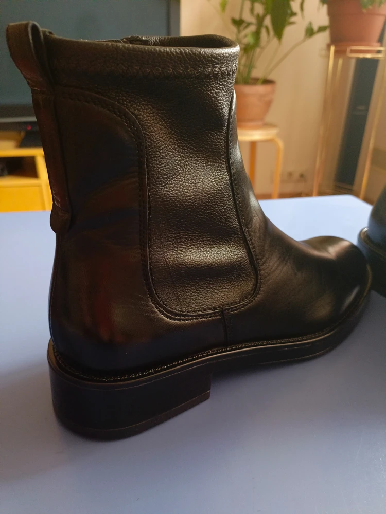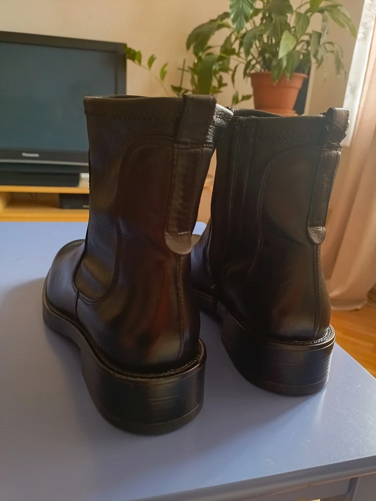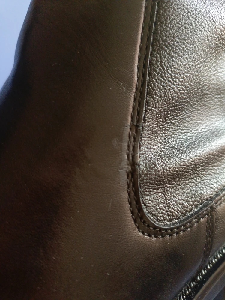 Недостатки: Есть небольшой дефект края кожи, около строчки на боковой вставке, на фото видно, надеюсь, не пойдет дальше расползаться кожа при носке. Коробка в ужасном состоянии, ботинки каким то образом целы