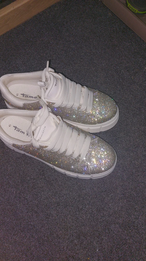 - Уж если выбирать пару в стиле гламур, то отдайте предпочтение этой модели. Для пошива пары использовали прочный текстиль, который украсили россыпью серебристых страз по всему периметру пары. Нежность и эстетичность паре придает жемчужно-белая подошва, шнурки и геометрический задник ей в тон. Утрированно широкая визуально массивная подошва хорошо амортизирует и почти не скользит, делая каждый шаг комфортным. Штробельная конструкция подошвы добавляет гибкости носочной части, что создает идеальный комфорта при носке.