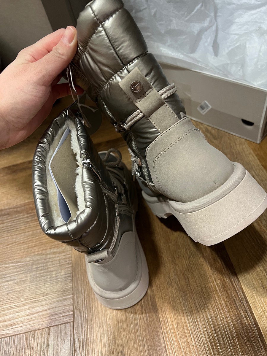 - Стеганые сапоги из водоотталкивающего нейлона укрепили деталями из эко кожи снизу. Утепленную модель установили на широкую облегченную подошву с нескользящим протектором. Голенище с внутренней молнией, затягивается сверху кулиской, чтобы холодный воздух не проникал внутрь. Пару дополнили шнуровкой с фиксатором.