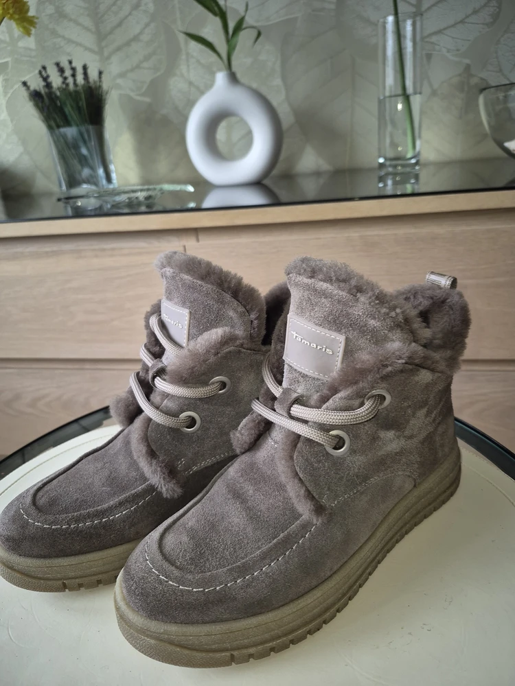 Шикарные зимние кроссовки из натуральной кожи (спилок) сложного бежевого цвета! Внутри и на пятке натуральный мех. Подошва из светлого ТЭП - супернескользкая! Смотрятся на ноге очень красиво! Идут в размер - на мой 38 идеально подошёл 38 размер обуви, хотя внутри мех. Tamaris, вы, как всегда, на высоте! Спасибо!