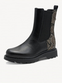 - Чёрные женские ботинки челси со вставкой из змеиного принта станут отличным выбором для повседневного образа. Эти стильные ботинки выполнены из веганской кожи, имеют зубчатую подошву и невысокий каблук. Голенище дополнено принтом под кожу питона, что придаёт им изысканный вид. Мягкая стелька Touch it адаптируется под форму стопы, обеспечивая дополнительный комфорт. Эластичные вставки по бокам делают процесс обувания лёгким и удобным. Лаконичный дизайн позволяет effortlessly сочетать их как с брюками, так и с юбками, добавляя разнообразие в ваш гардероб.