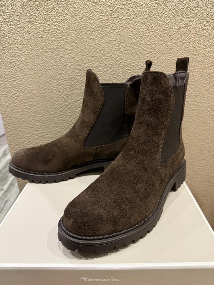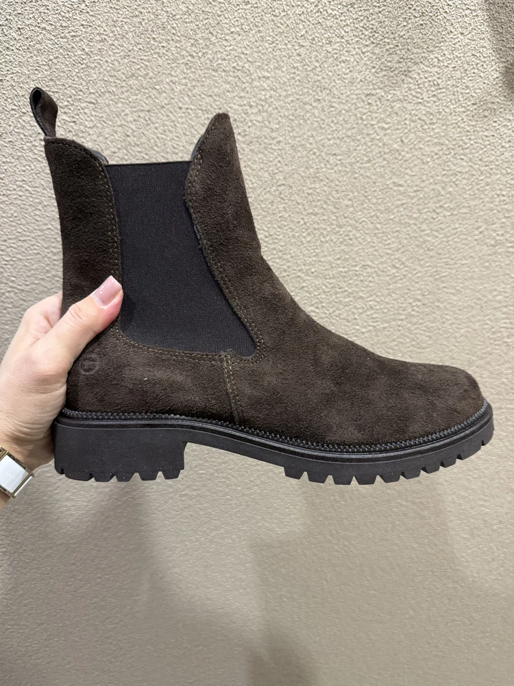 С костюмом из твида и черными челси Tamaris - добавьте к образу сумку-портфель и минималистичные украшения.