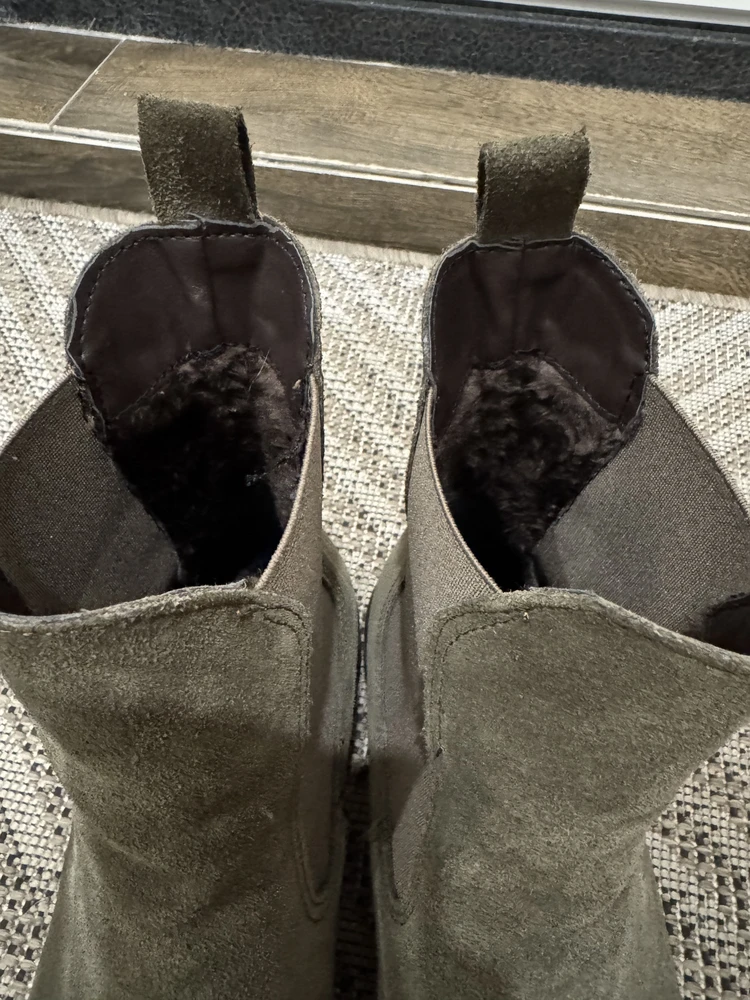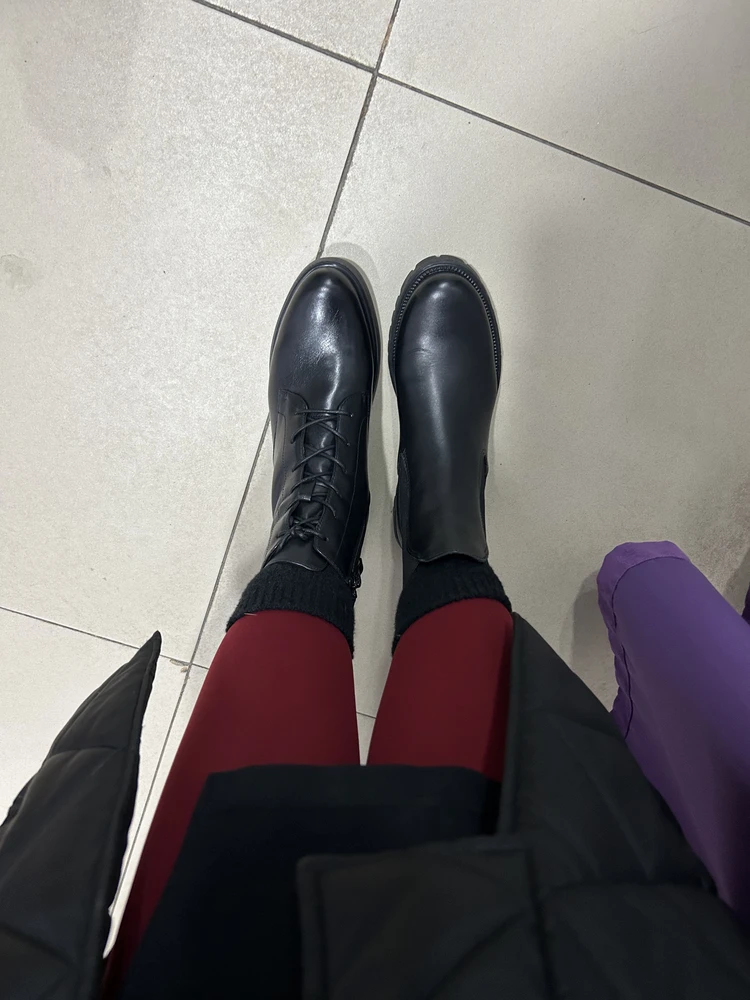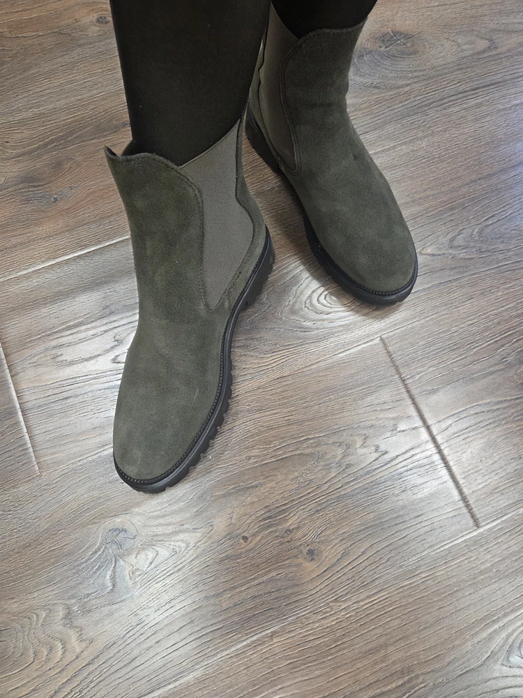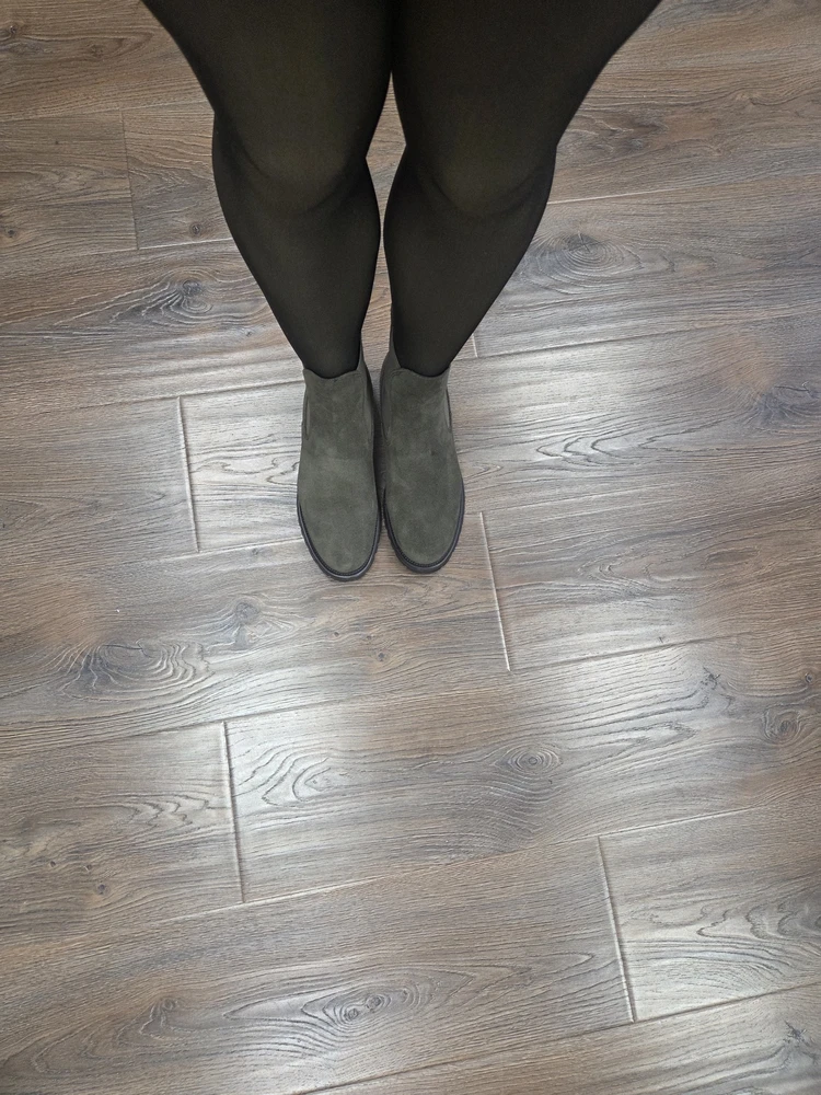 Ботинки просто супер! Натуральная замша выглядит благородно, цвет соответствует фото на карточках. Очень удобная колодка. Ноги )в тепле, внутри мягкие. На стопу 26 см и среднюю полноту подошли ботинки 39 размера. Смотрятся элегантно с джинсами и платьями. На Рекомендую!