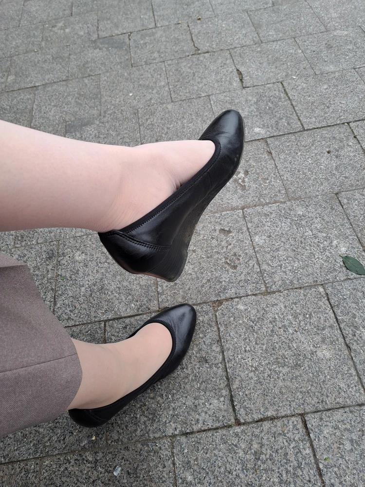 Долго искала туфли на невысокой танкетке и вот нашла. Удобные, мягкие. Сразу отработала весь день в этих туфельках и ножки не устали. Очень удобная колодка. Задник тоже не доставил проблем. Стелька светлая, для меня это важно. На ноге смоторятся хорошо. Размеру соответсвуют Покупкой довольна